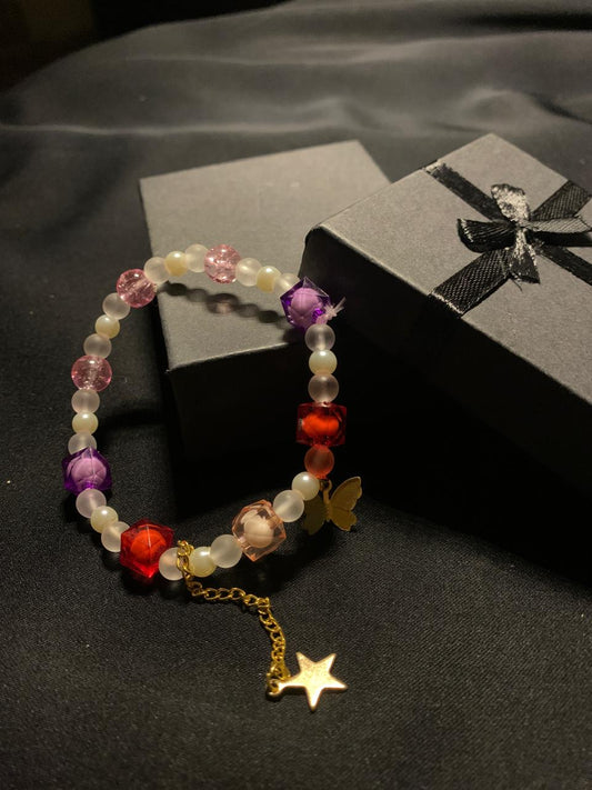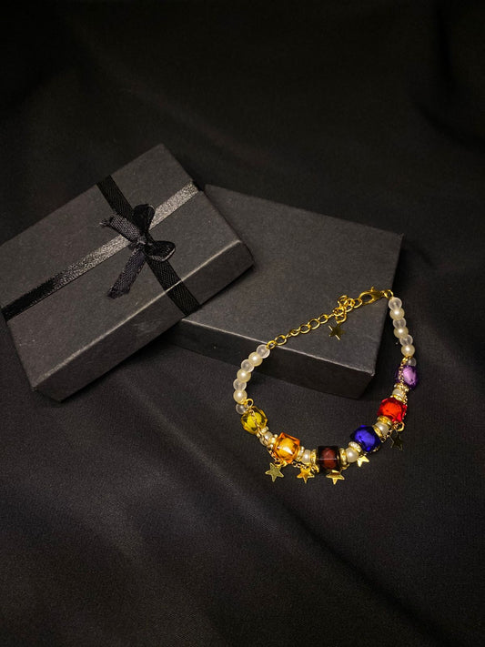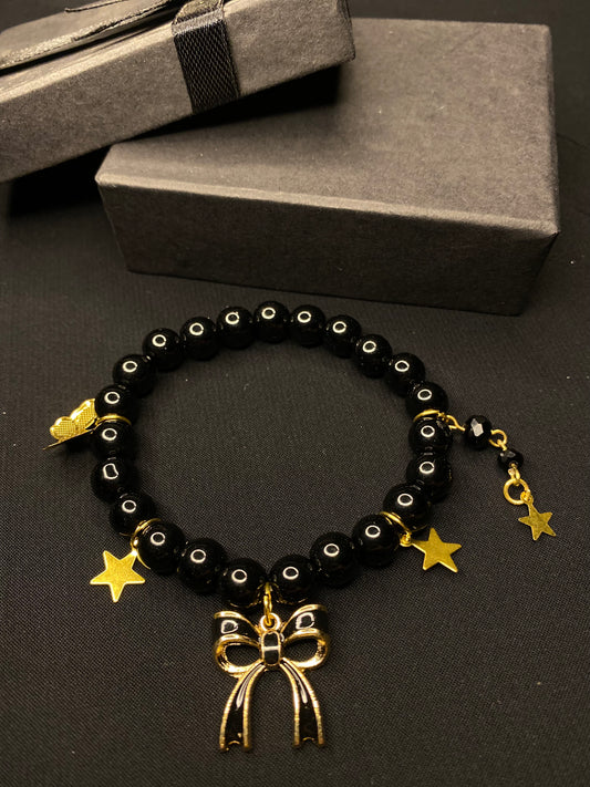 BRBST-01- Black stones Bracelet with hanging Charma( Bow, Butterfly, Star)