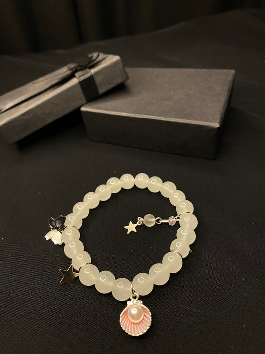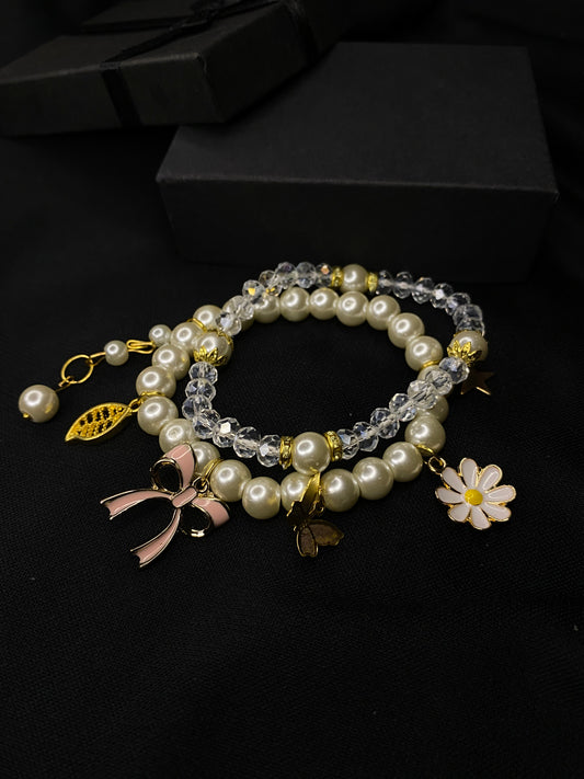 BRPMCH-00- Pearls Bracelet with Mix Charms( Butterfly, Daisy Flower, Bow, Leaf, Star)